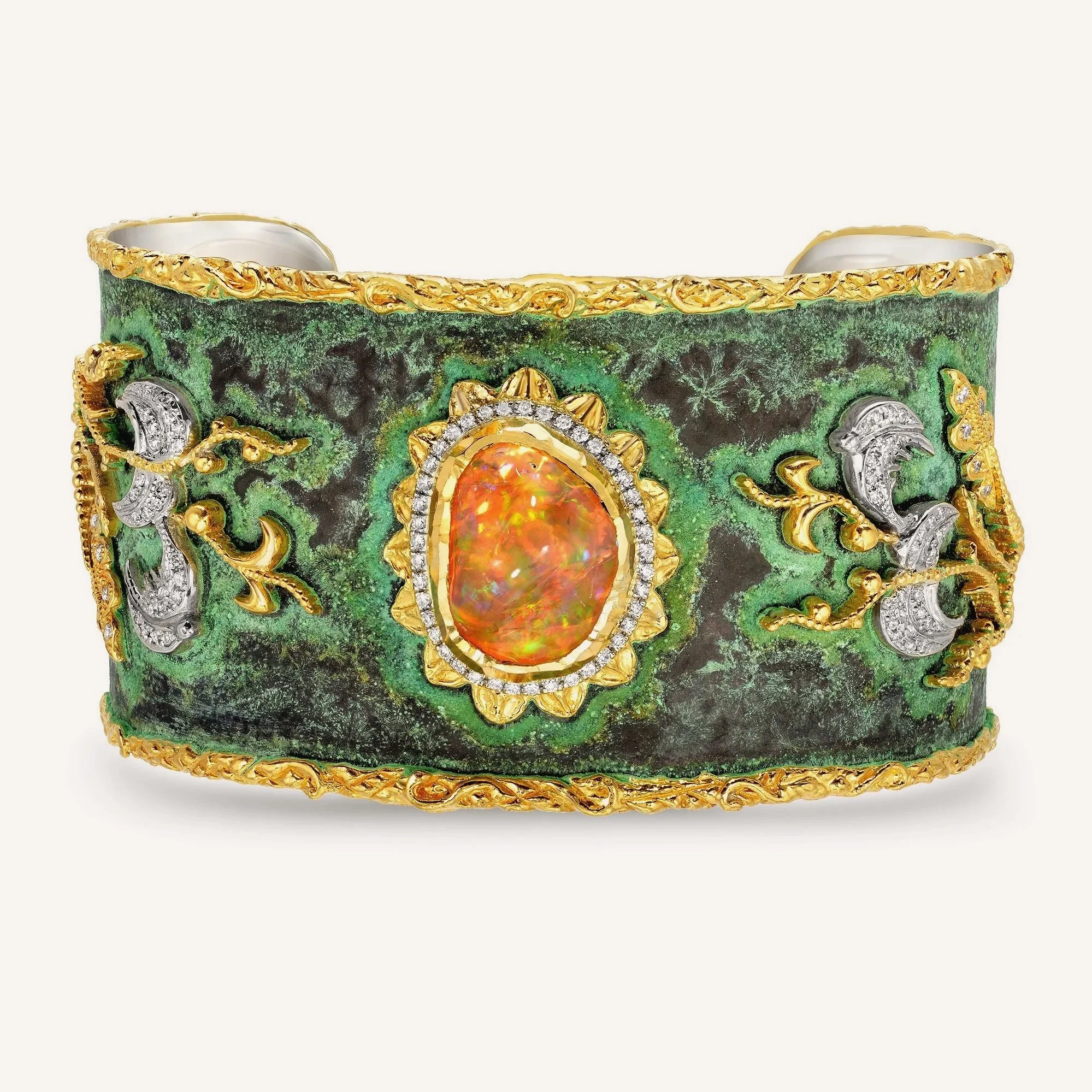 Mexica Fire Opals, Chrome Diopsides in Cuff in Green Patina